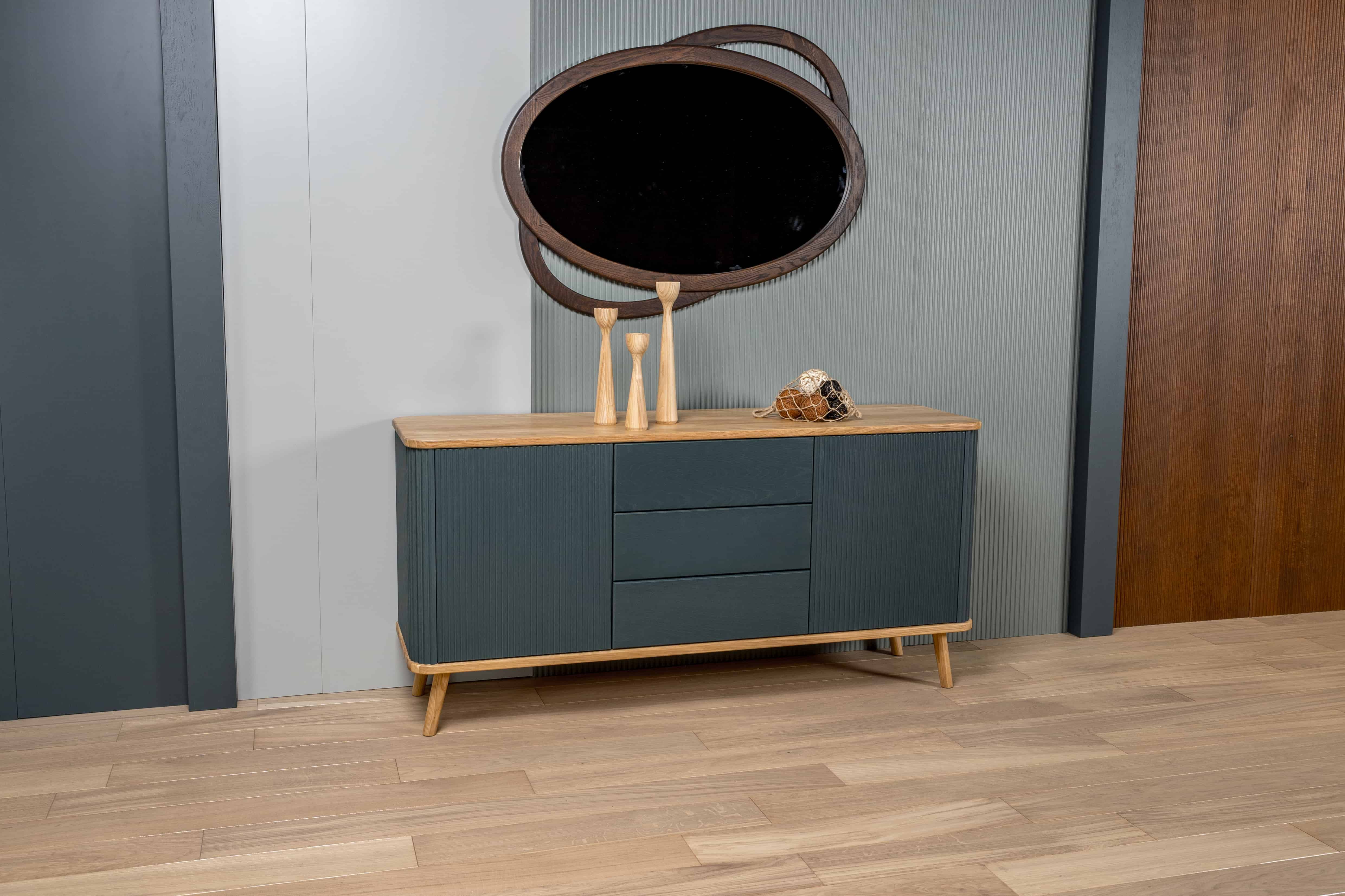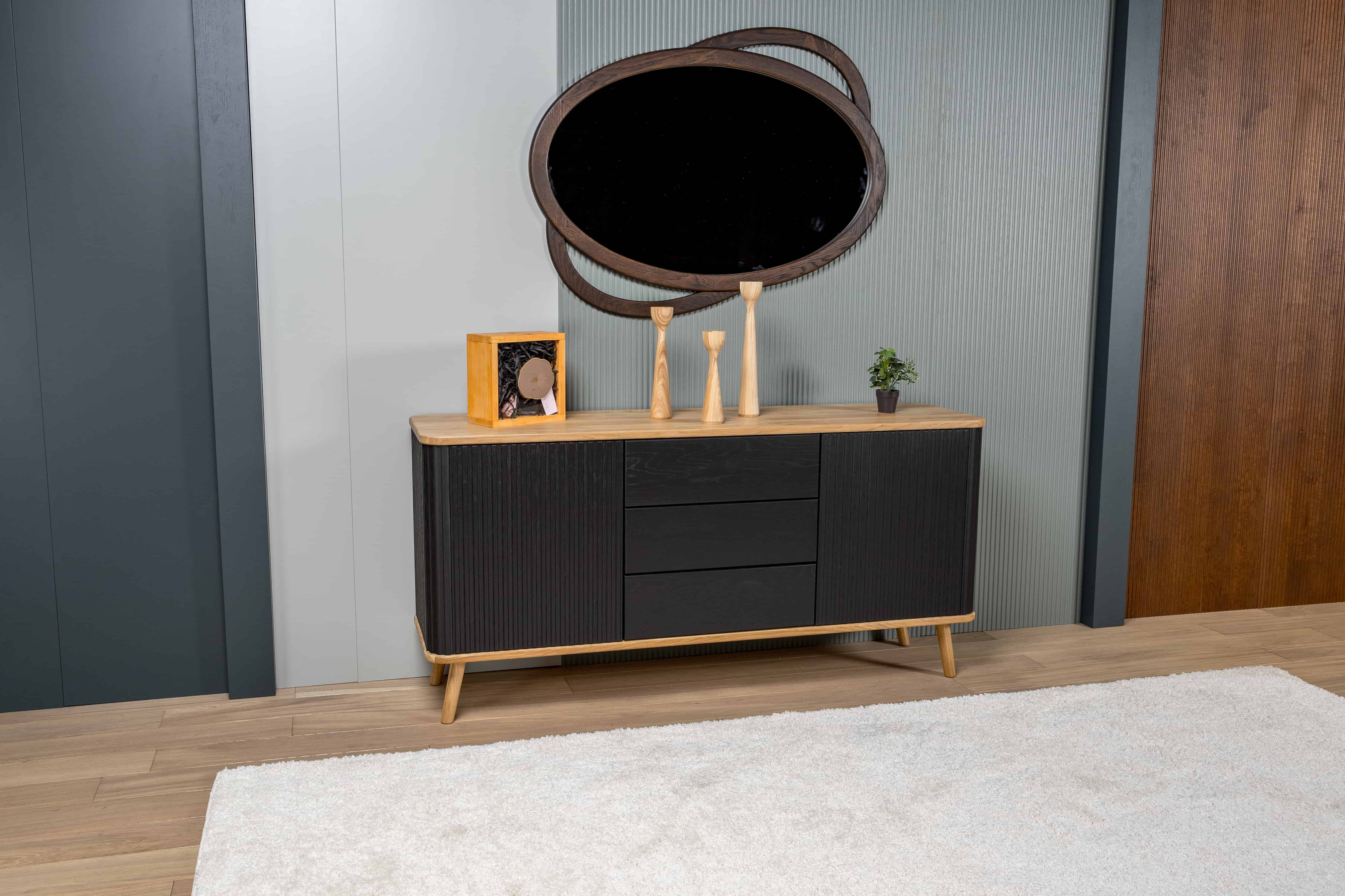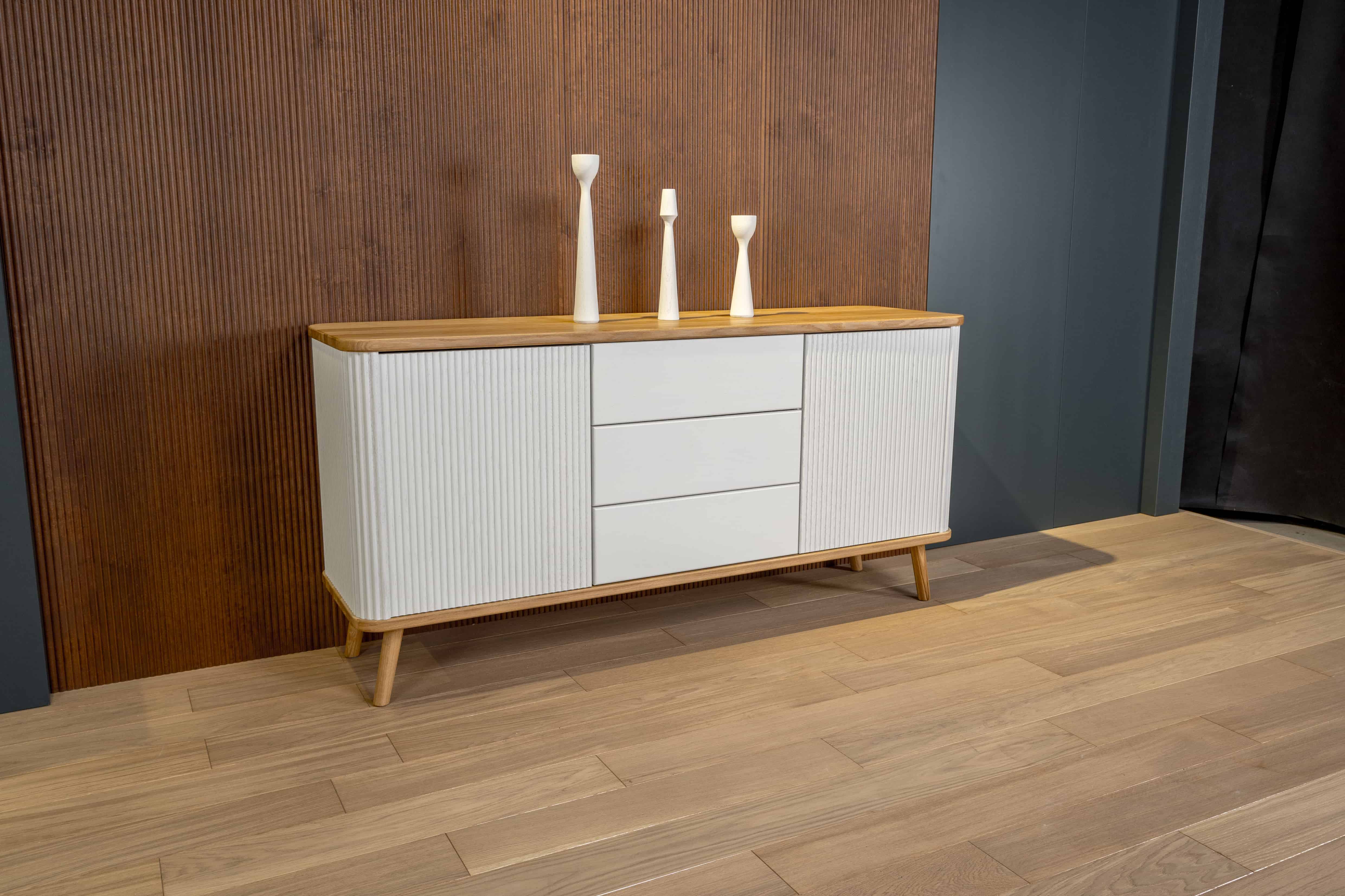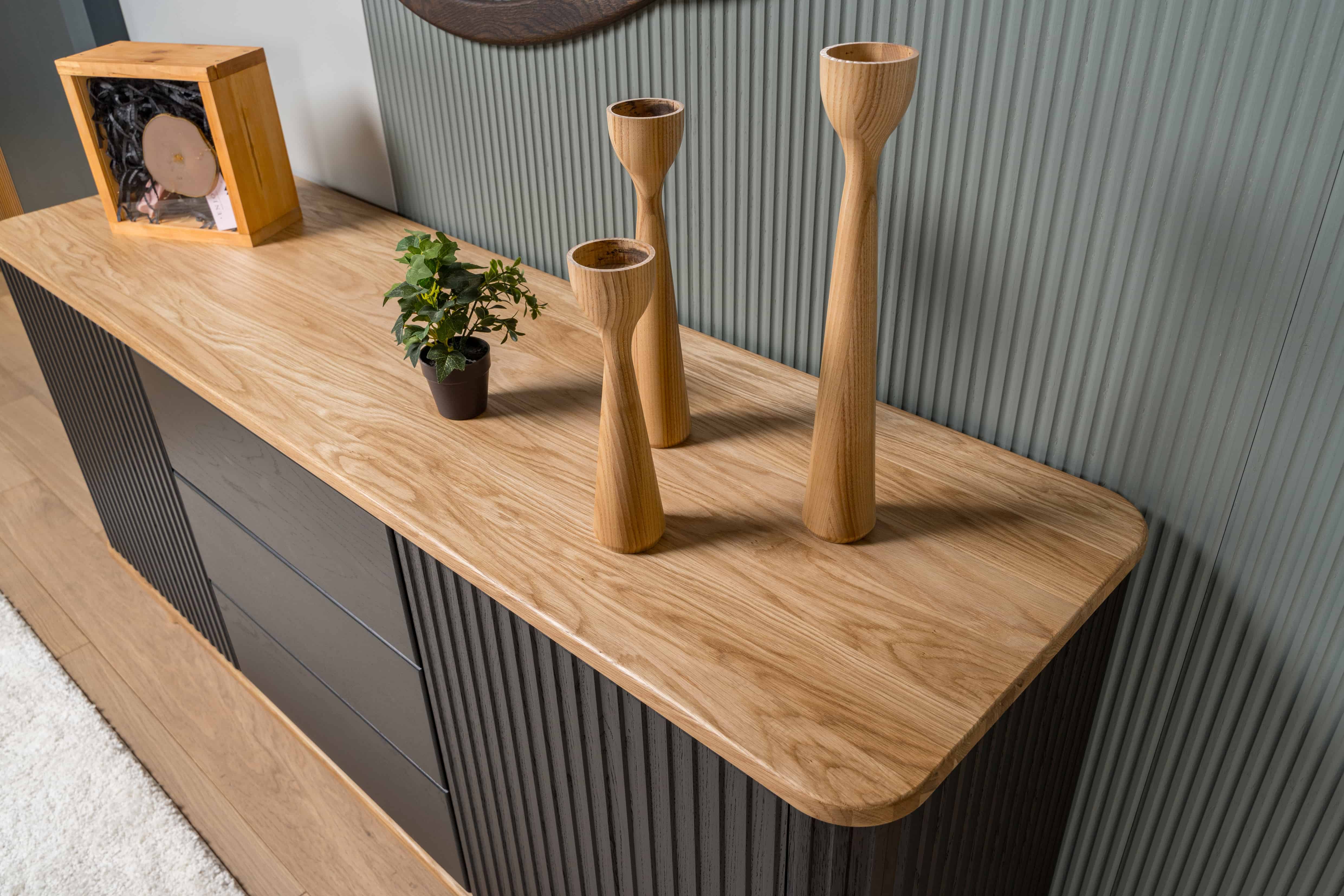 Комод Арона с изящными радиусными формами и рельефными фасадами, созданными фрезеровкой. Выполнен из массива дуба с сохранённой природной текстурой и оснащён тремя ящиками, двумя дверцами и фурнитурой с доводчиками.