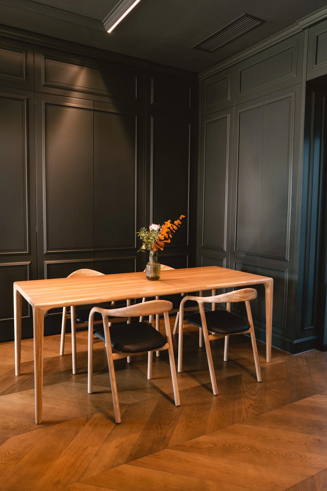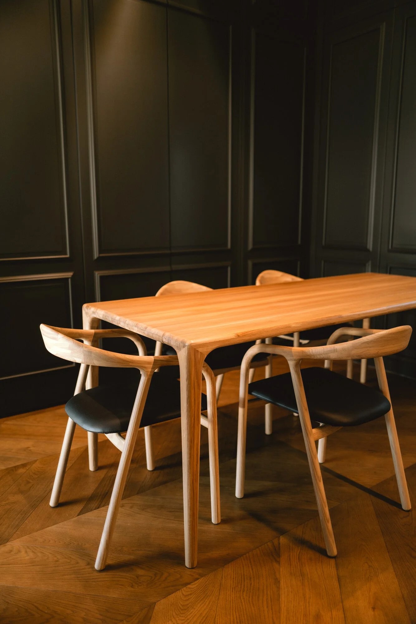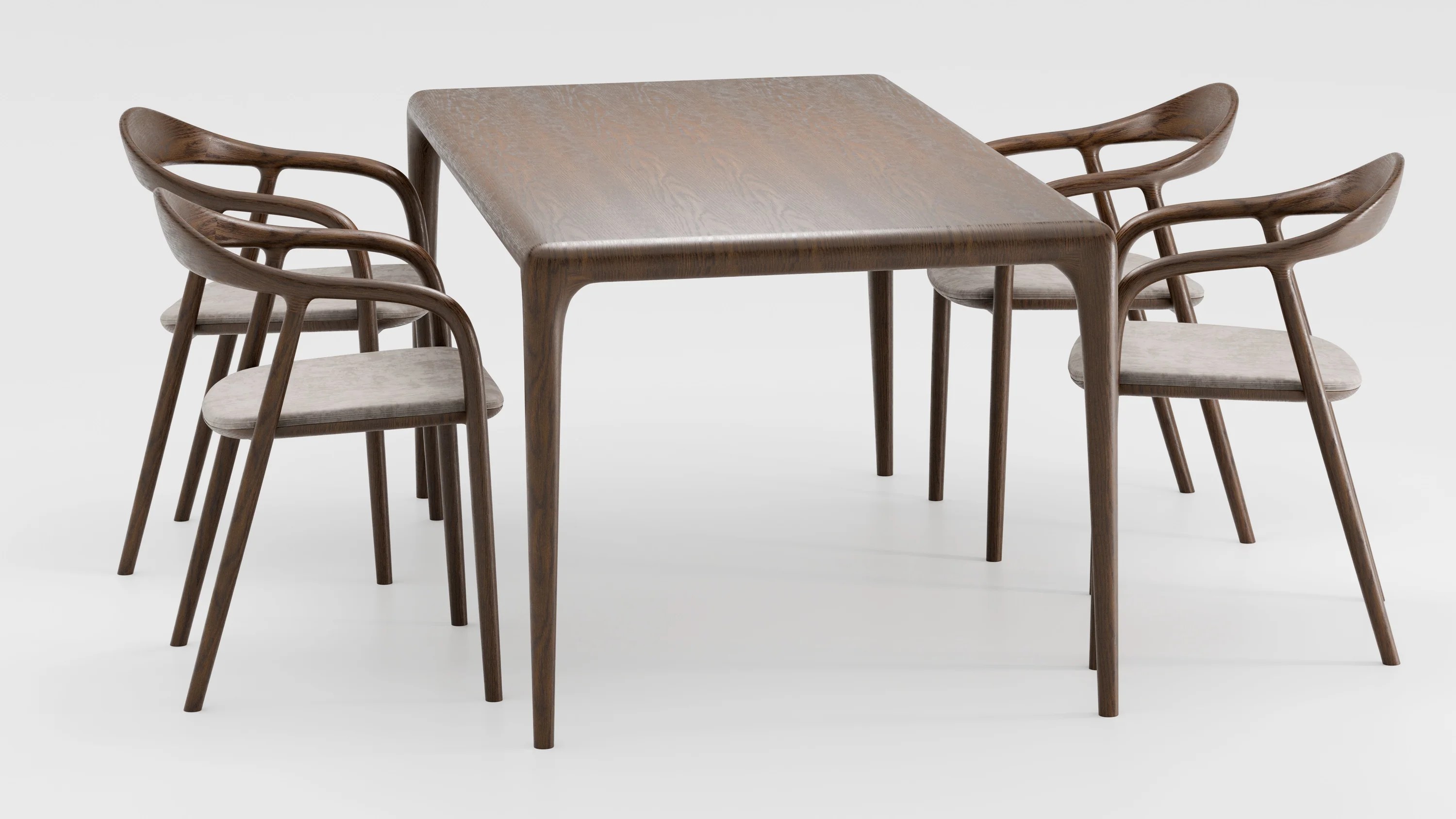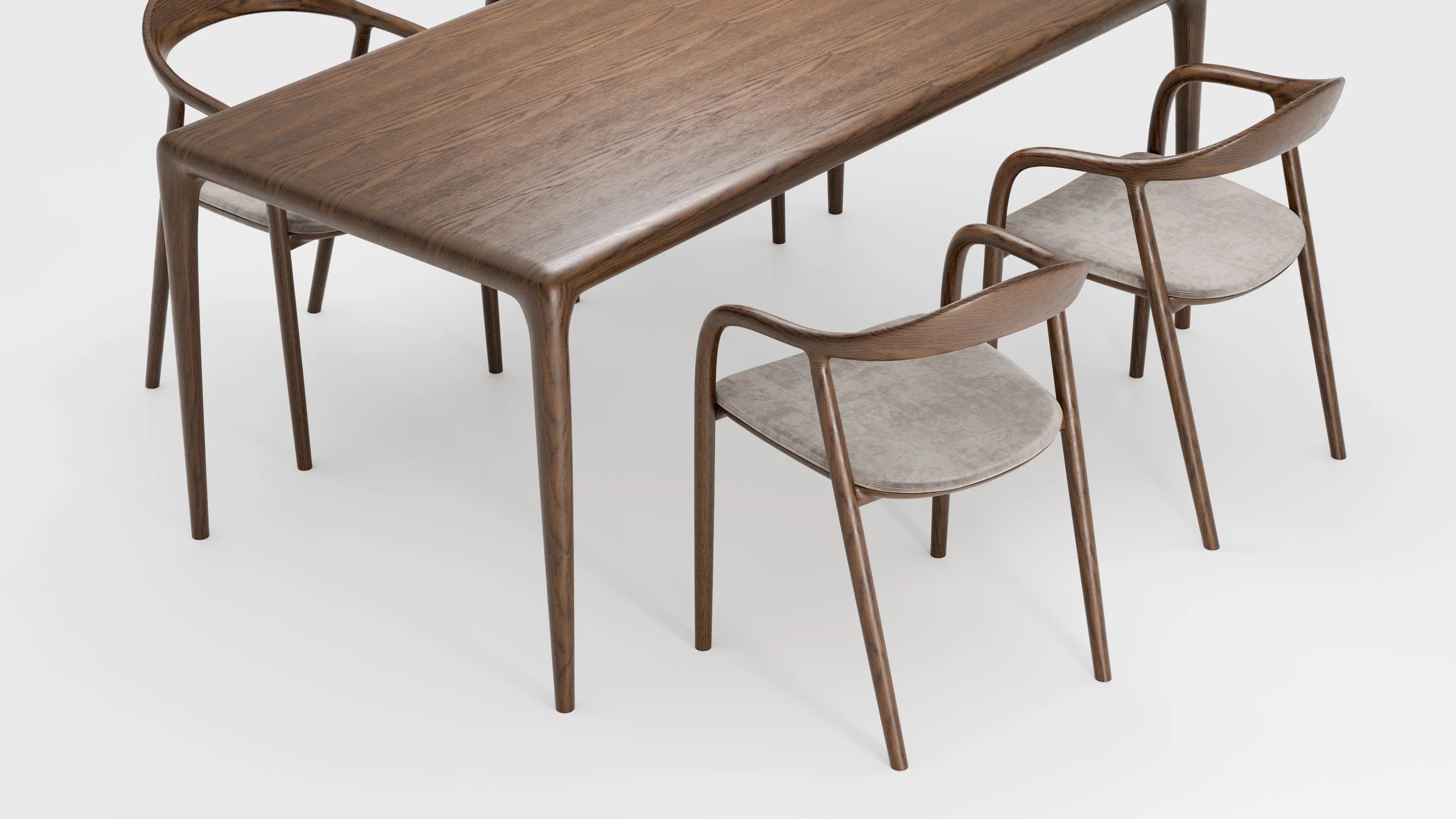 Стол Веццо создан из массива дуба — благородного материала, проверенного временем. Каждая доска тщательно отобрана и объединена в единое целое, образуя идеально гладкую поверхность без стыков. Естественный рисунок древесины плавно перетекает по всей длине столешницы, подчёркивая её чистоту и изысканность.